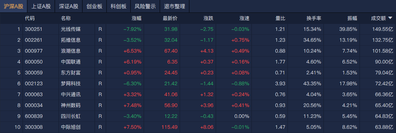 沪深两市半日成交额1.28万亿元,较上个交易日放量2352亿元。南财金融终端显示,个股方面,光线传媒半日成交额超149亿元居首,拓维信息、浪潮信息、中国联通成交额靠前。
